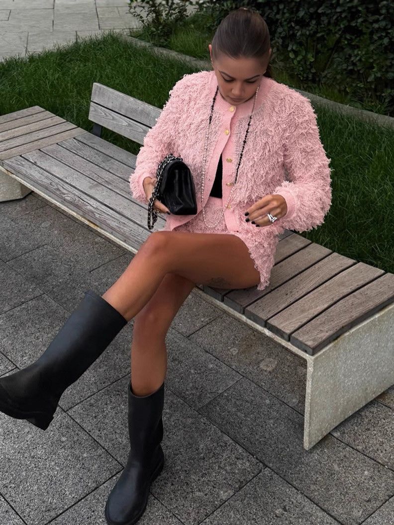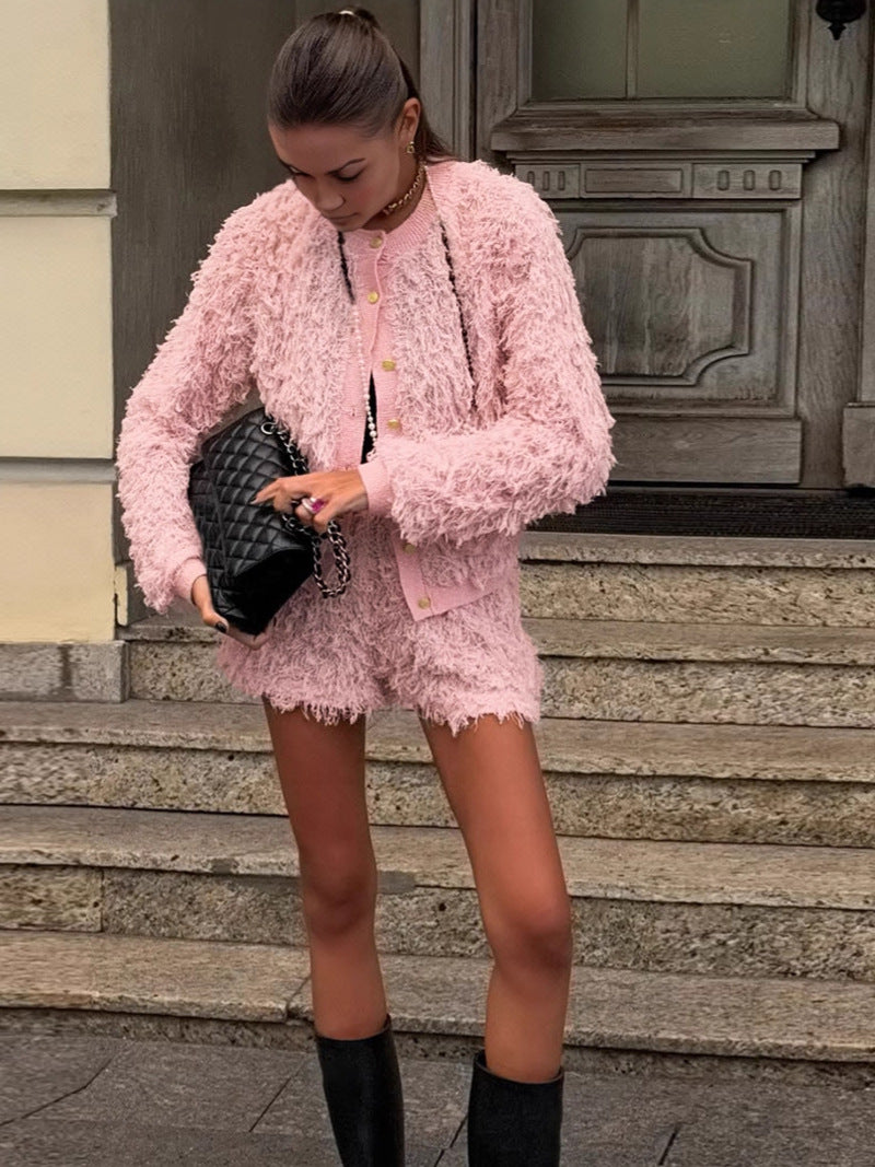 The most delightful interpretation of urban chic: ChicFluff offers an energetic, feminine, and versatile look with its soft, fluffy texture, gold-buttoned jacket detail, and mini shorts. For a fresh look with sneakers or a bold look with over-the-knee boots, you can achieve a bold look.