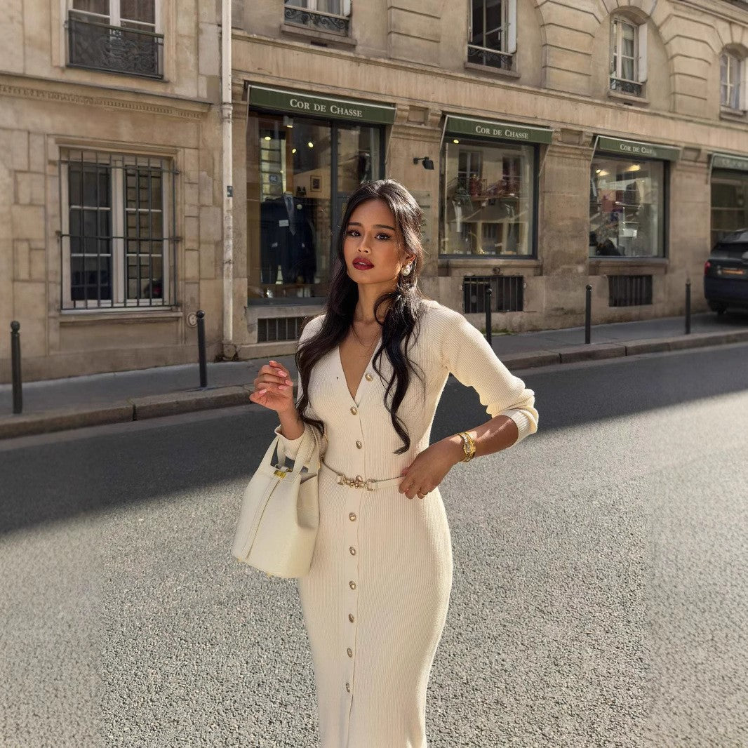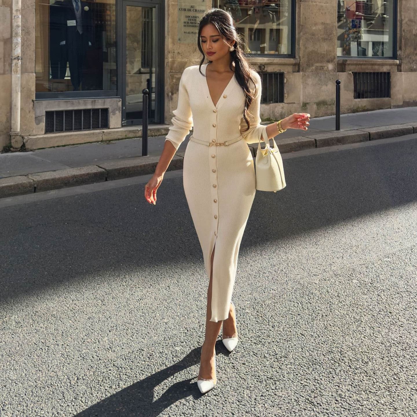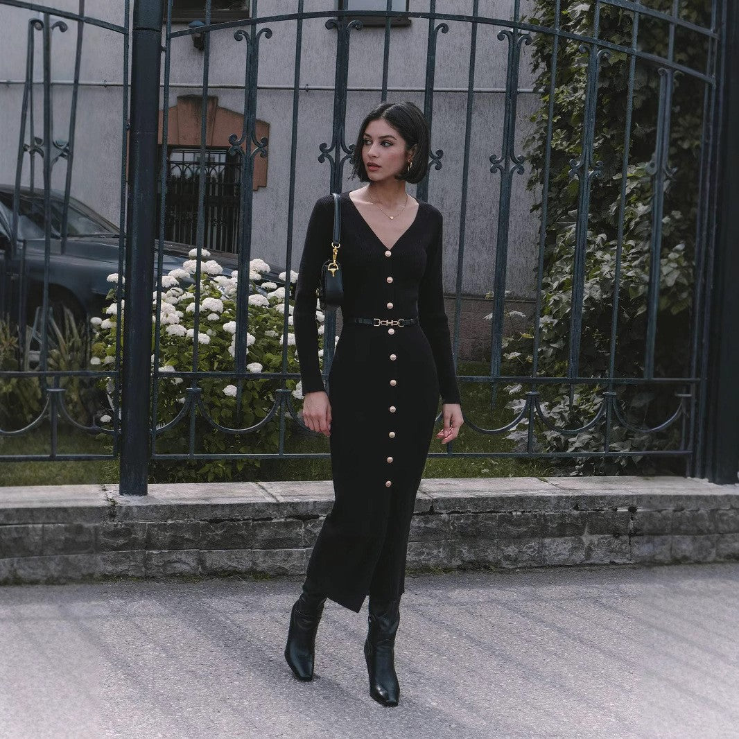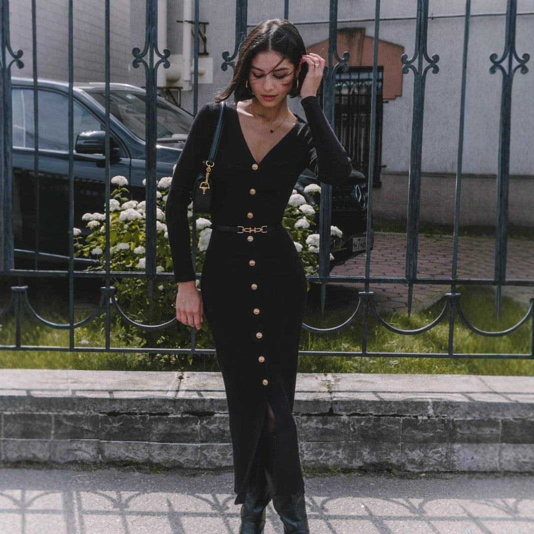 🔹 Sophisticated and timeless elegance: The Button-Detail Knit Maxi Dress brings refined charm to every moment — from daytime meetings to evening gatherings. With its V-neckline and figure-hugging silhouette, it creates a modern, polished look while the long skirt accentuates a graceful, feminine presence. 💃 Whether you’re at a business meeting or a special event, this dress ensures all eyes are on you with effortless sophistication.