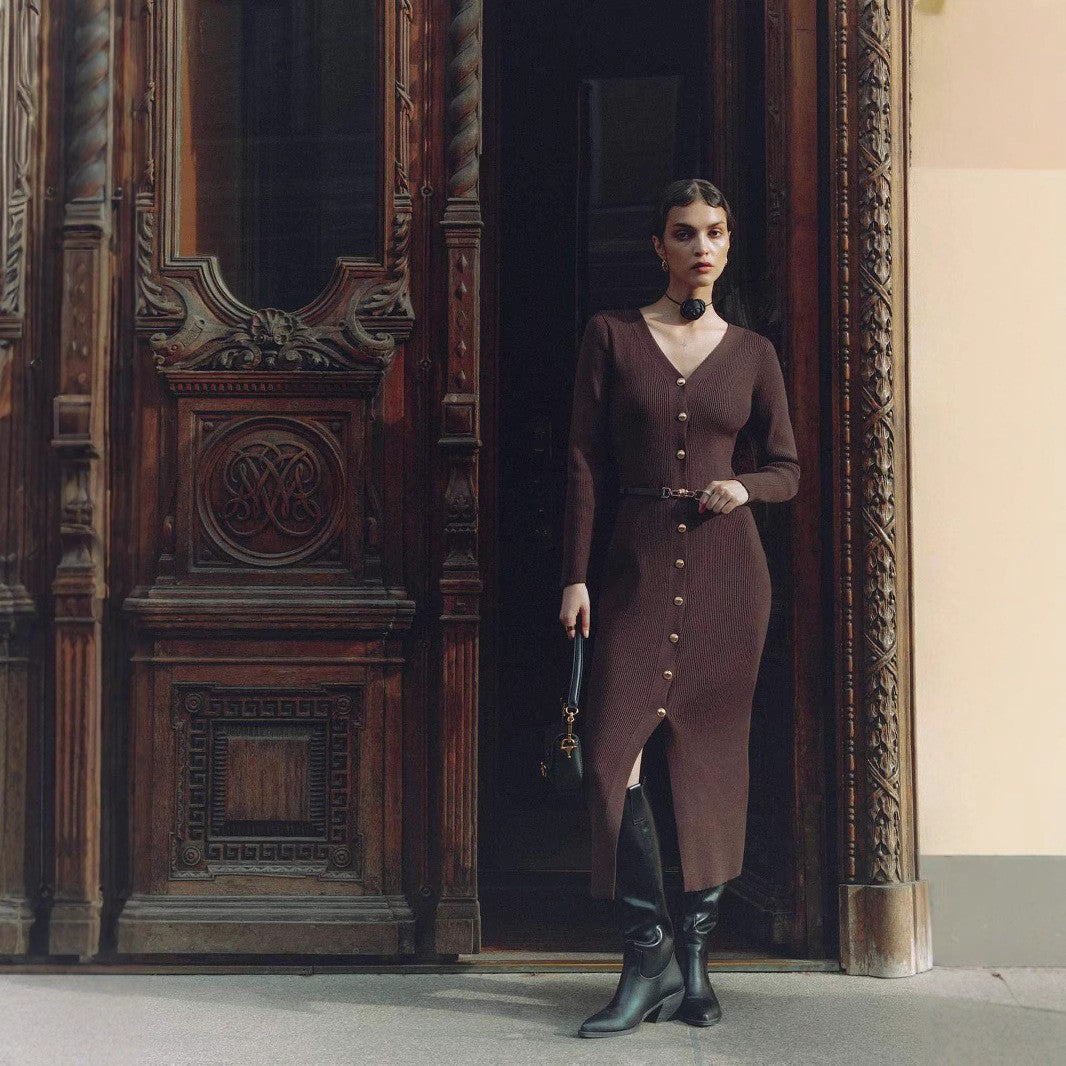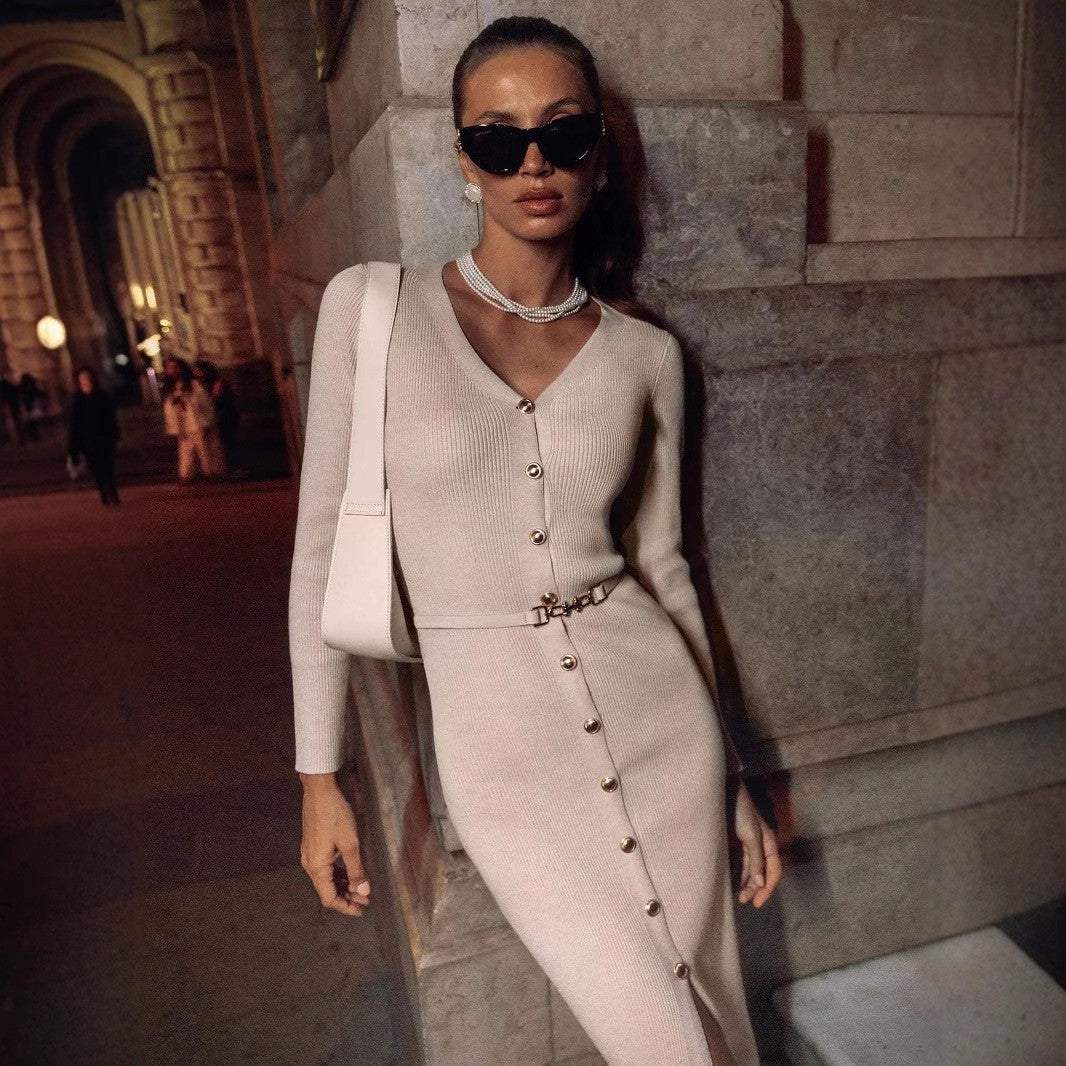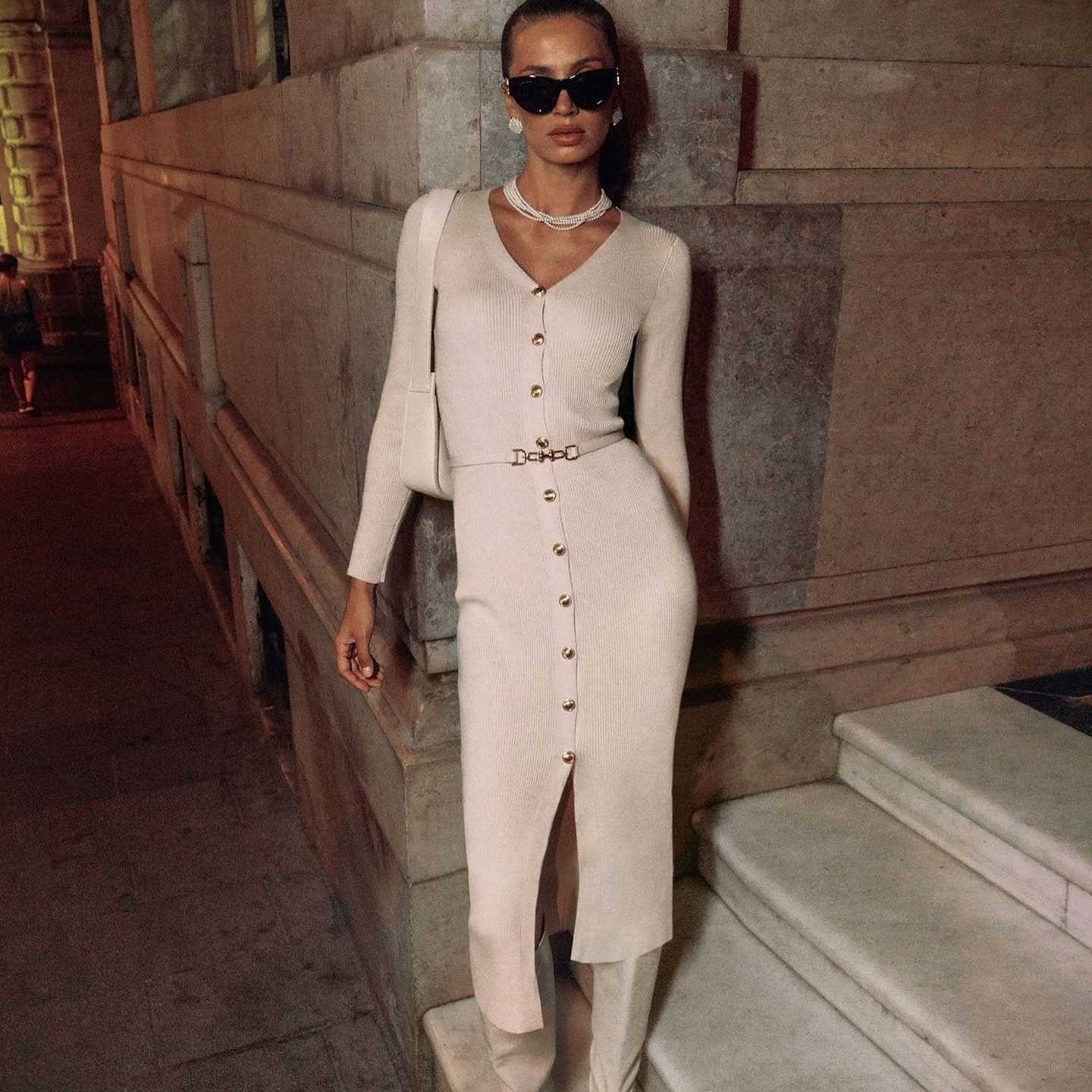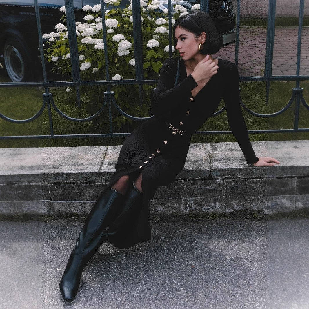 🔹 Sophisticated and timeless elegance: The Button-Detail Knit Maxi Dress brings refined charm to every moment — from daytime meetings to evening gatherings. With its V-neckline and figure-hugging silhouette, it creates a modern, polished look while the long skirt accentuates a graceful, feminine presence. 💃 Whether you’re at a business meeting or a special event, this dress ensures all eyes are on you with effortless sophistication.