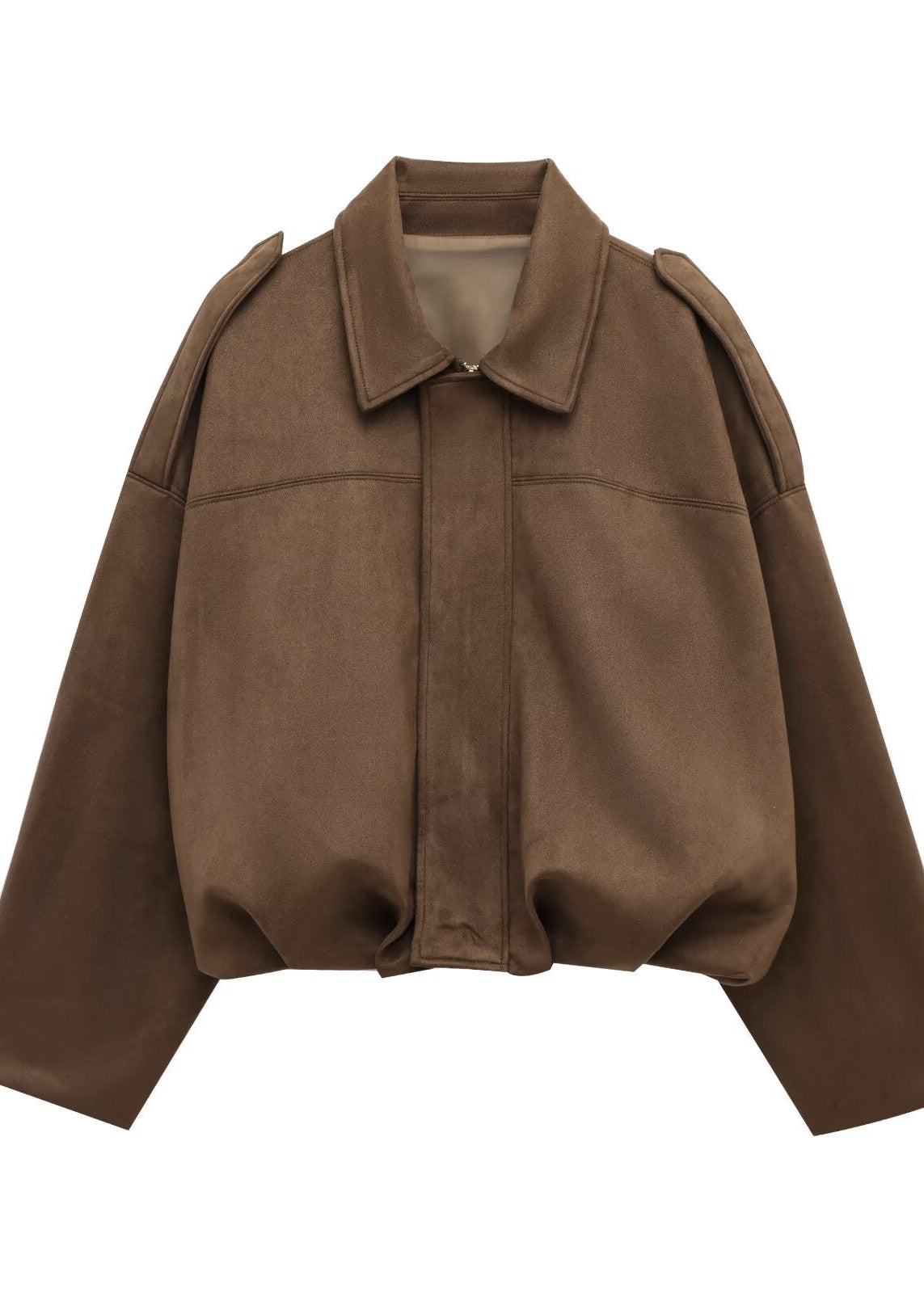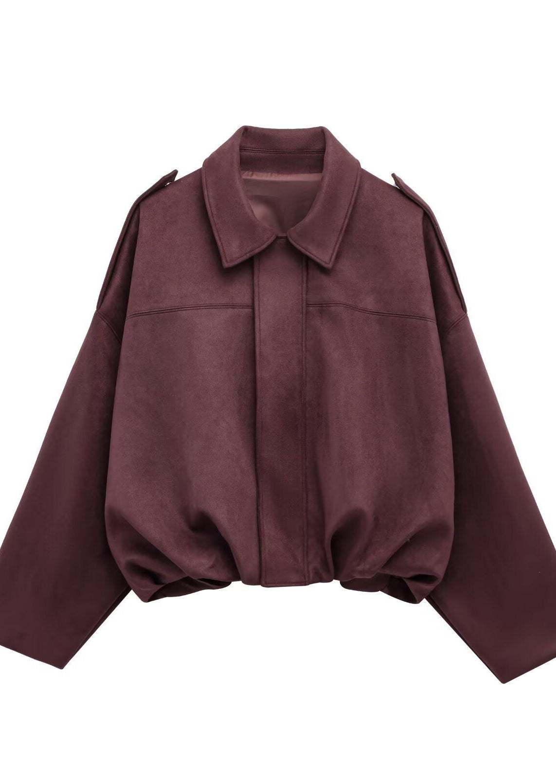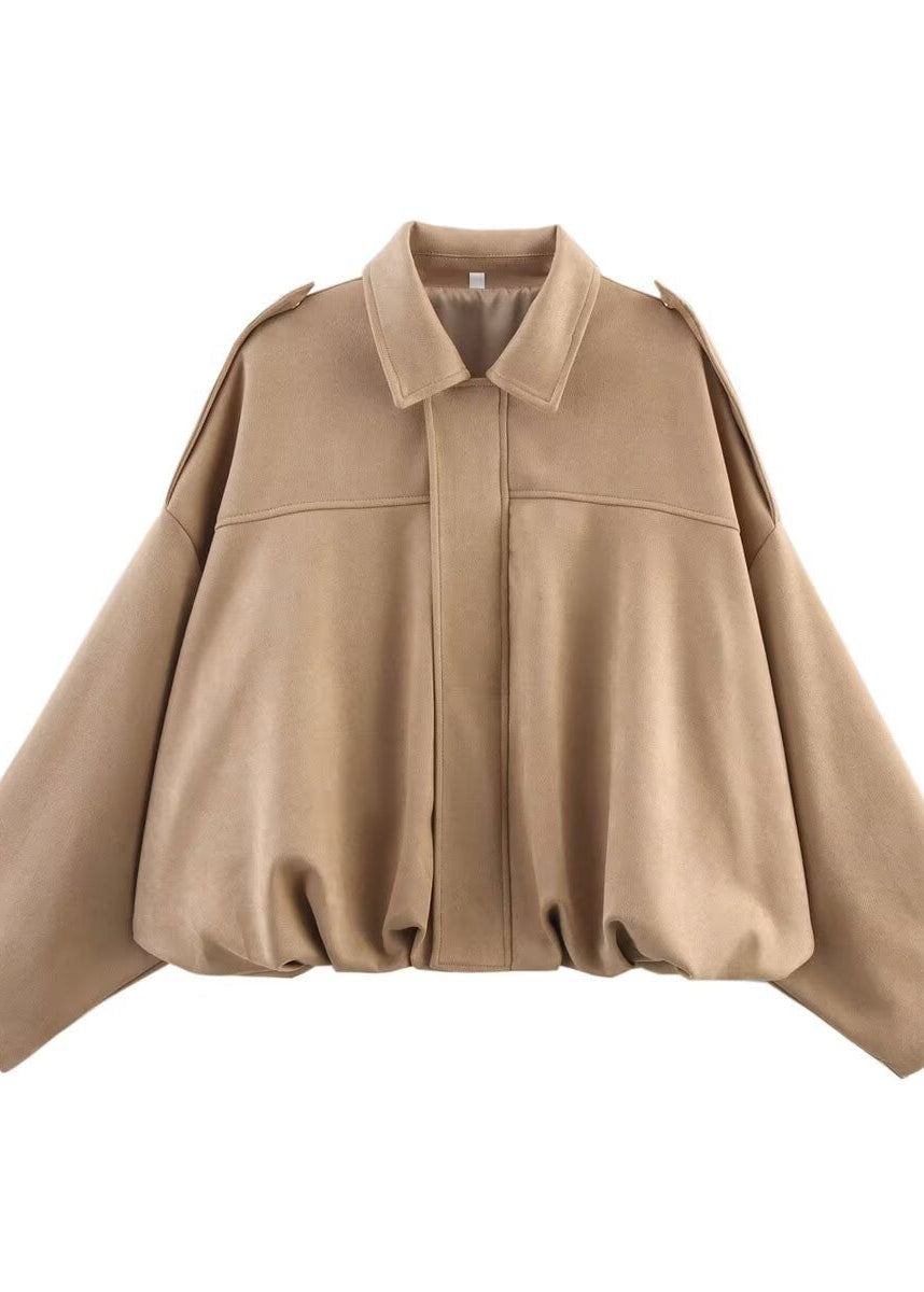 The soft-touch premium fabric drapes beautifully, creating a subtle balloon effect that adds volume without feeling heavy. The structured collar and clean front line bring a refined, minimalist edge — perfect for city strolls, café moments, or elevated casual outfits.