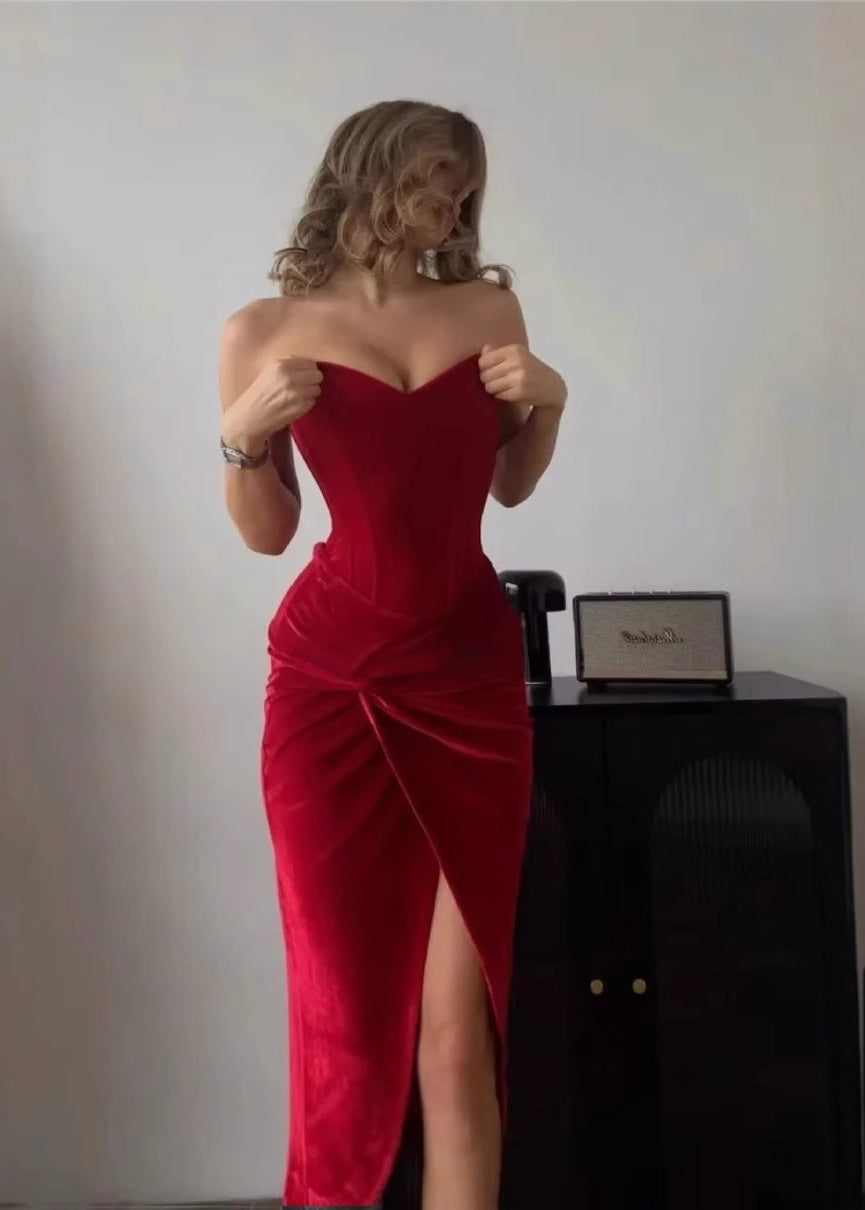 Zarafetin en tutkulu halini deneyimleyin. Maskot Scarlet Touch Kadife Elbise, lüks ve teninize yumuşak kadife dokusuyla sizi gecenin yıldızı yapmak için tasarlandı. Figürünüzü güzelce vurgulayan askısız kalp yakası, zarif ön drape detayıyla öne çıkan sofistike ve feminen bir silüet yaratıyor.
